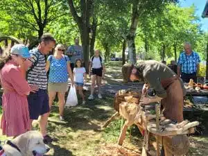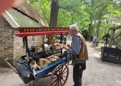 Je kunt turfstapelen, veel machines zijn in werking waaronder bij de houtzagerij. En natuurlijk de turfmachine op het hoogveengebied. De schooljuf wacht op de kinderen en de groenteman rijd met zijn kar door het dorp.